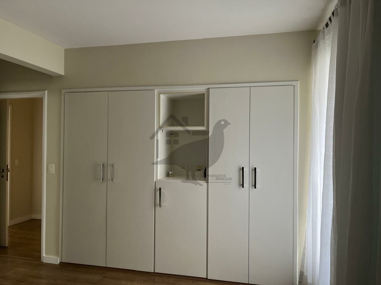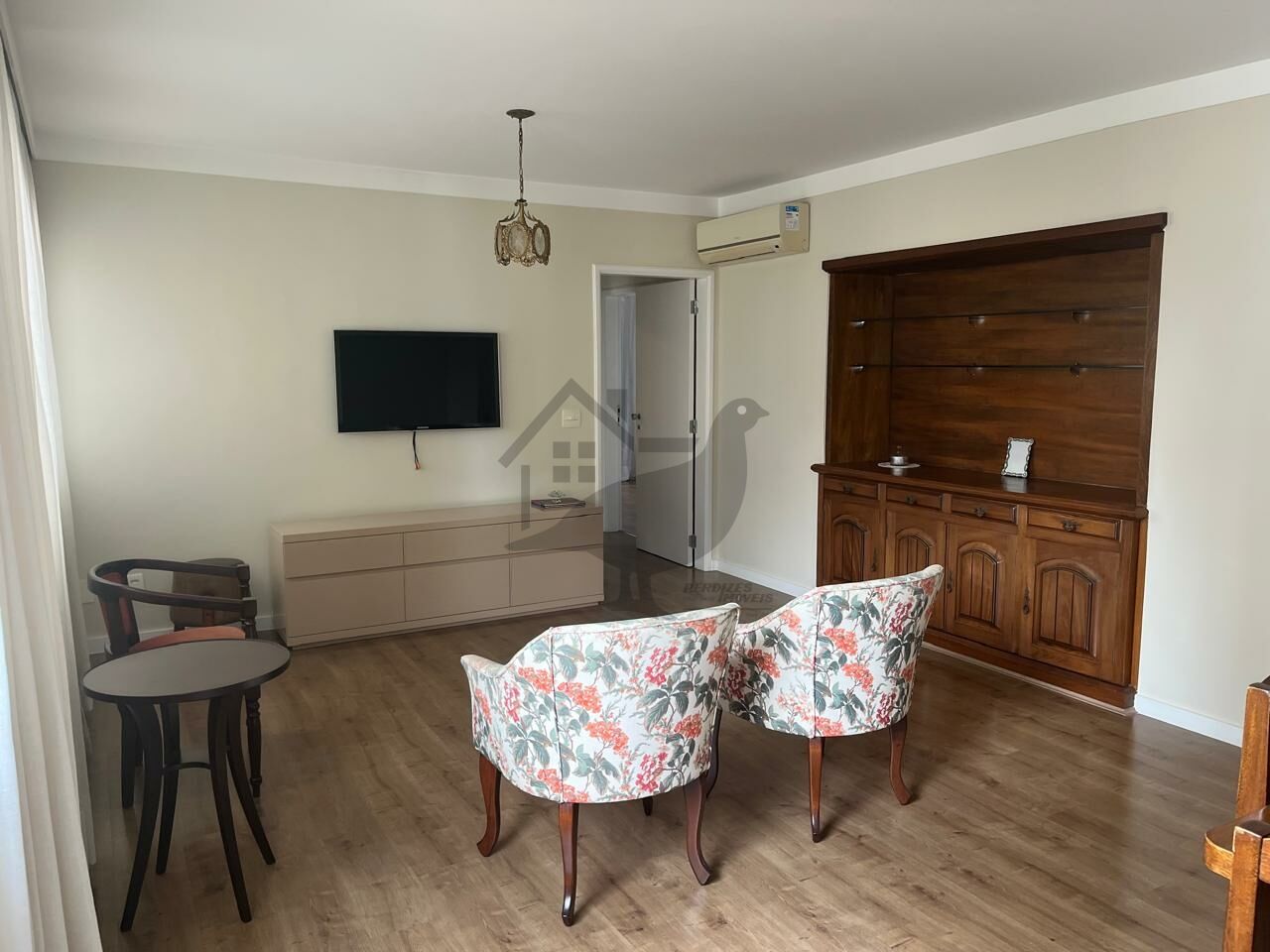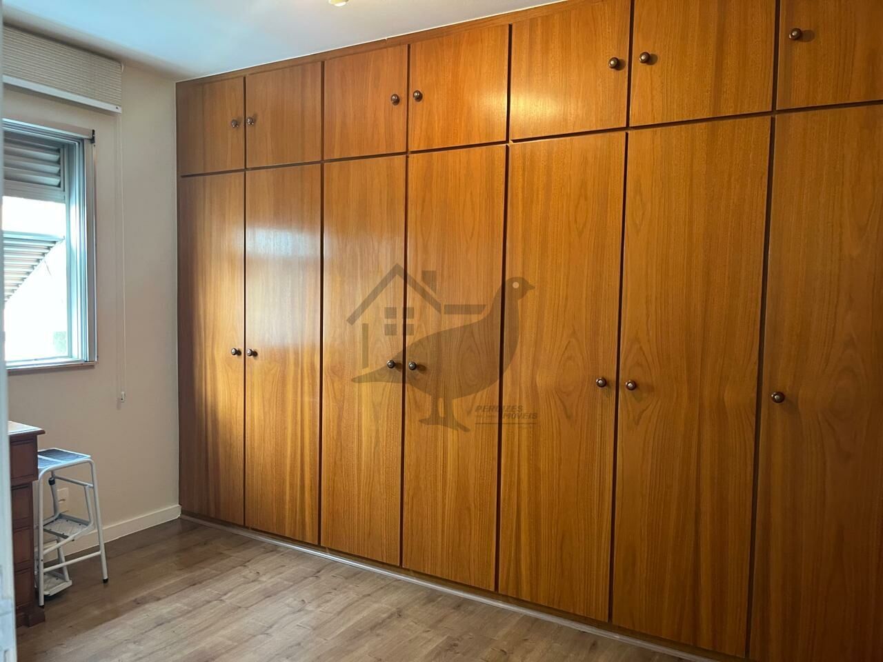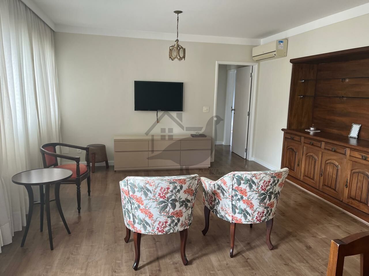 SALA PISO EM MADEIRA COM ESTANTE E JANELA BEM AMPLA