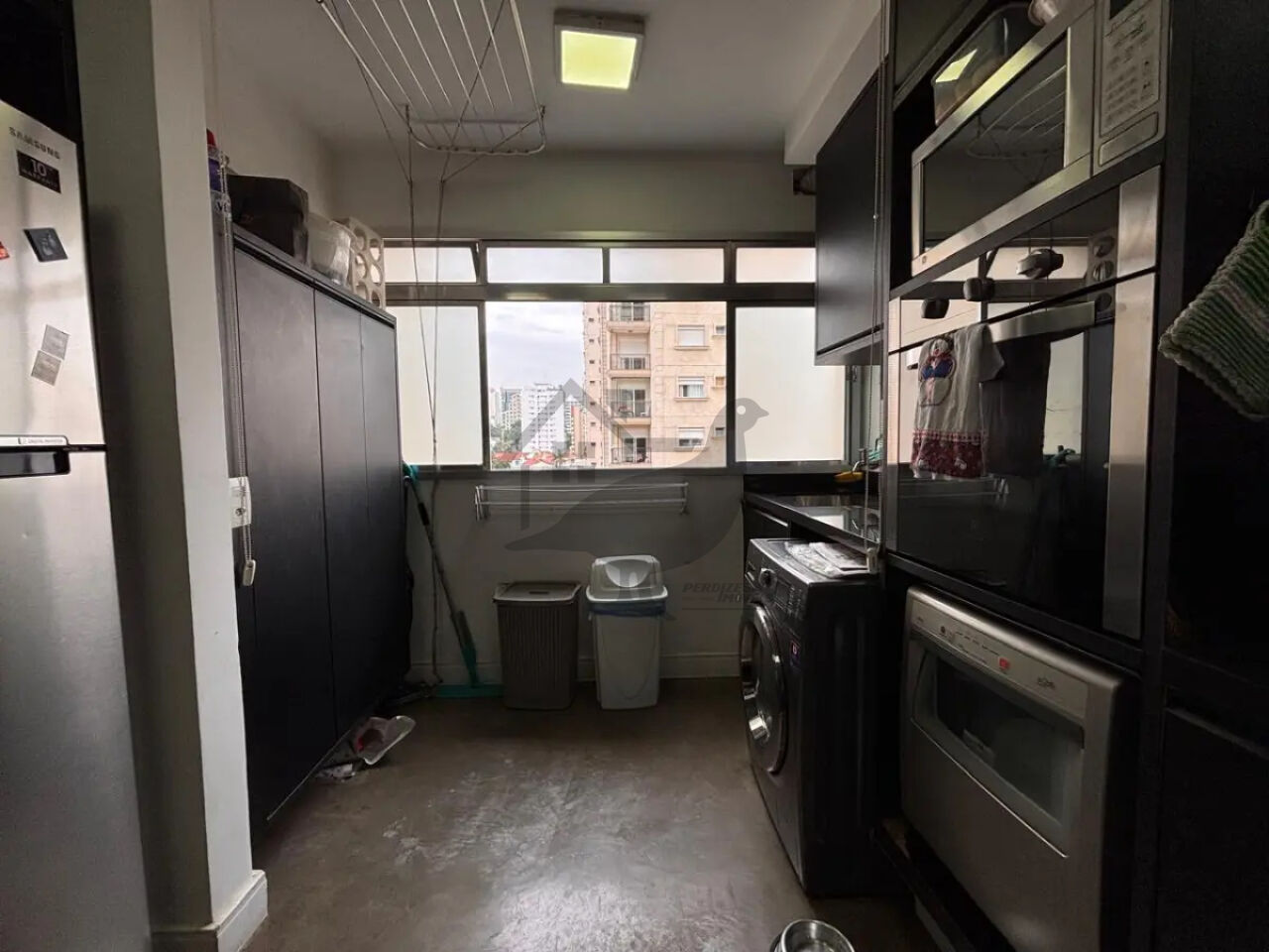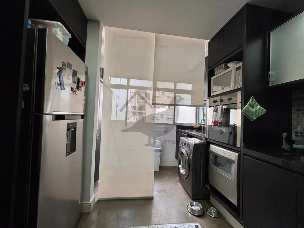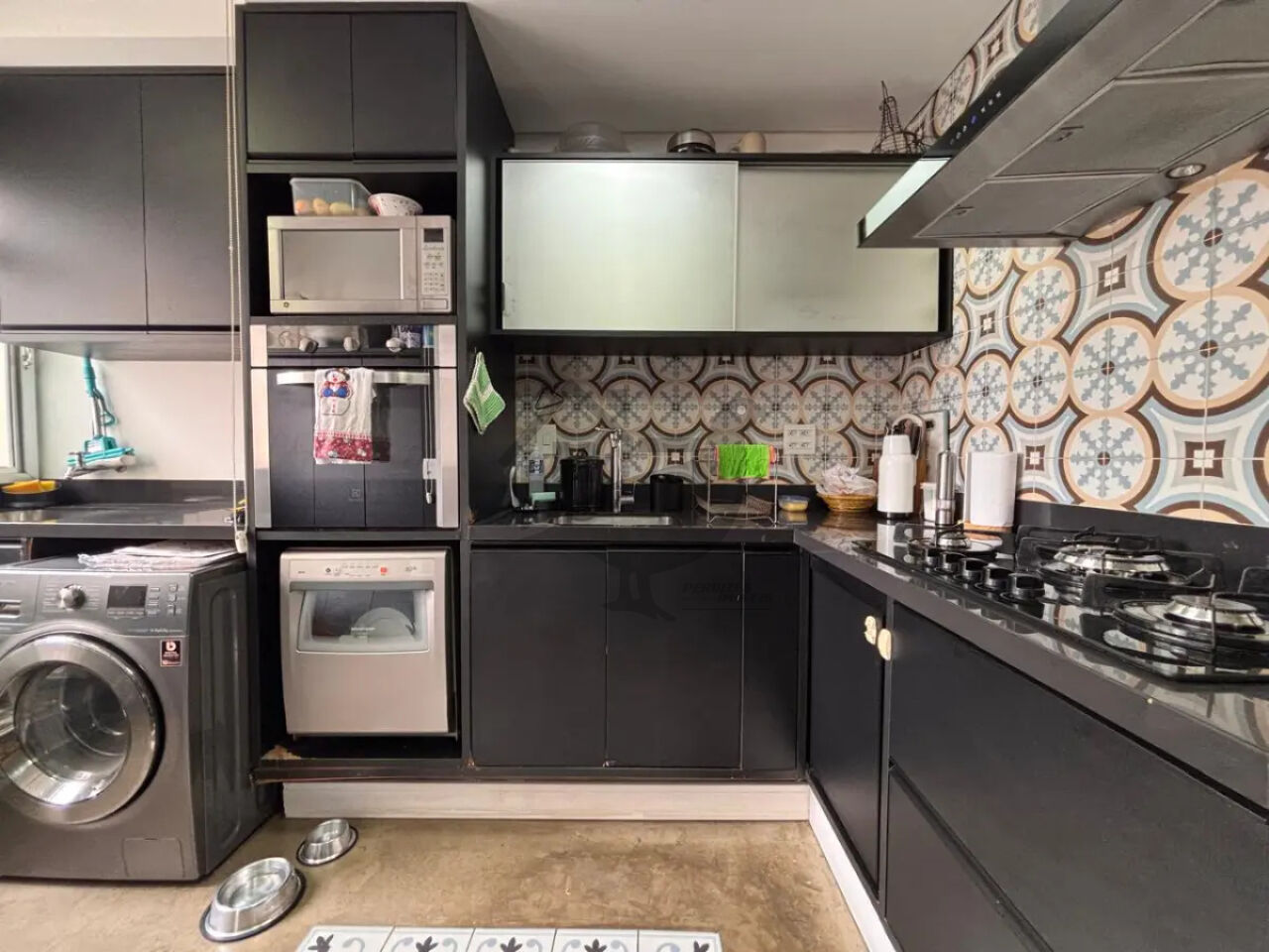 Cozinha moderna e funcional, integrada com uma área de serviço organizada.